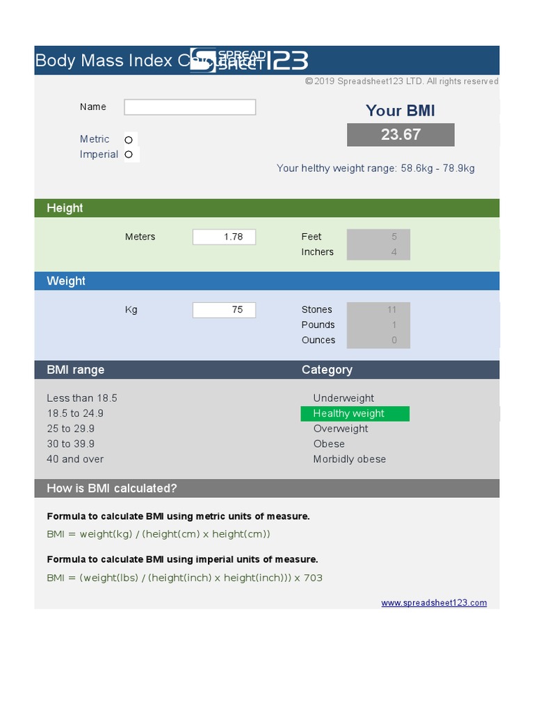 Enter your height and weight below and scars1s unique advanced bmi calculator will let you know the estimated impact of your present body weight and shape upon your overall health. It can tell you if you have a healthy or unhealthy weight.